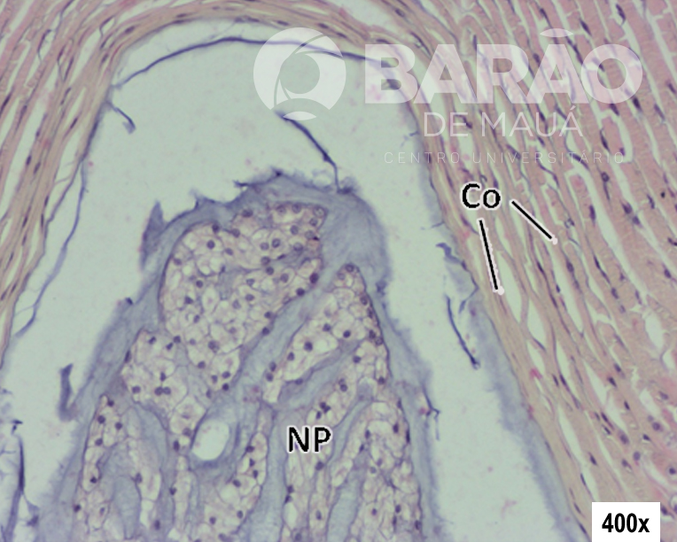 Cauda de Rato Disco Intervertebral - NP = núcleo pulposo, FC = fibrocartilagem, Co = condrócitos e V = vértebra - Coloração: H&E.