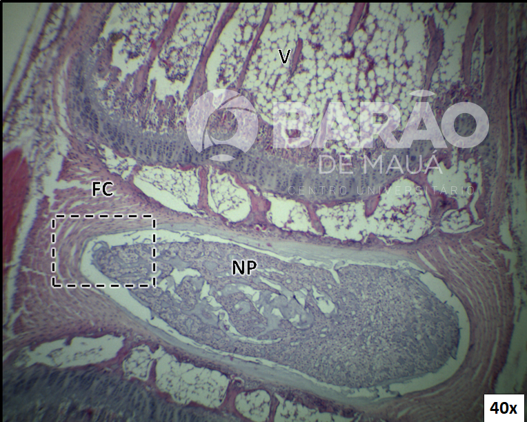 Cauda de Rato Disco Intervertebral - NP = núcleo pulposo, FC = fibrocartilagem e V = vértebra - Coloração: H&E