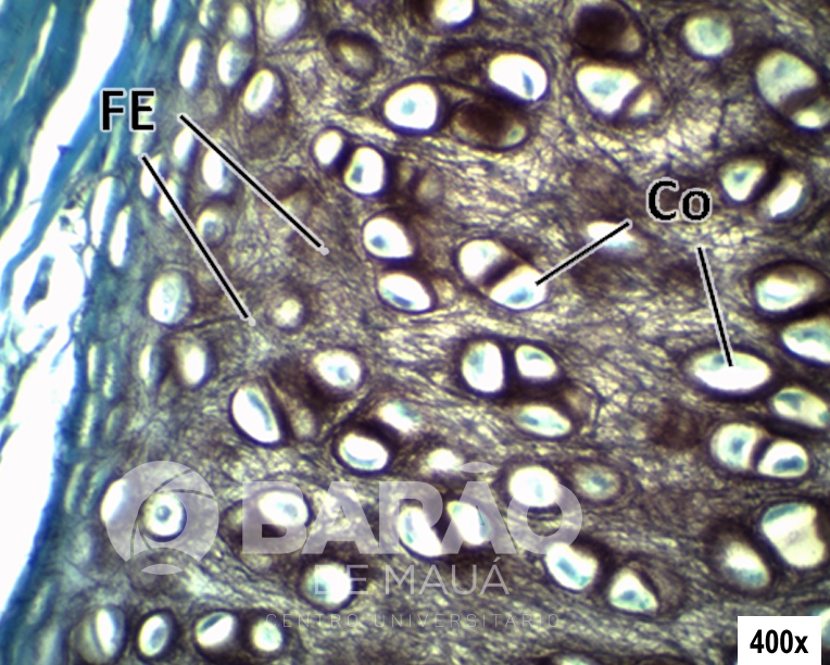 Orelha - FE = fibras elásticas, Co = Condrócitos - Coloração: Orceína.