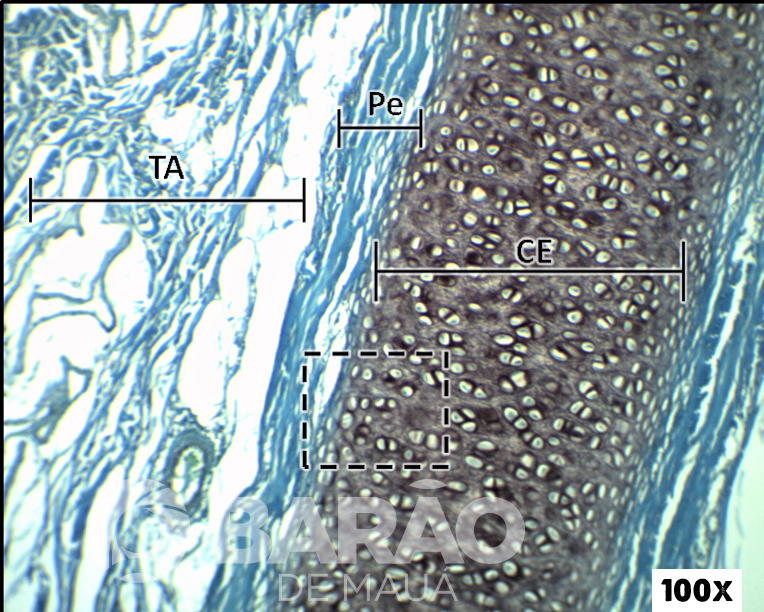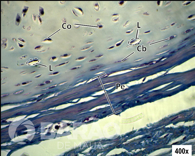 Traqueia - Pe = pericôndrio, Co = condrócitos, L = lacunas e Cb = condroblastos - Coloração: TM