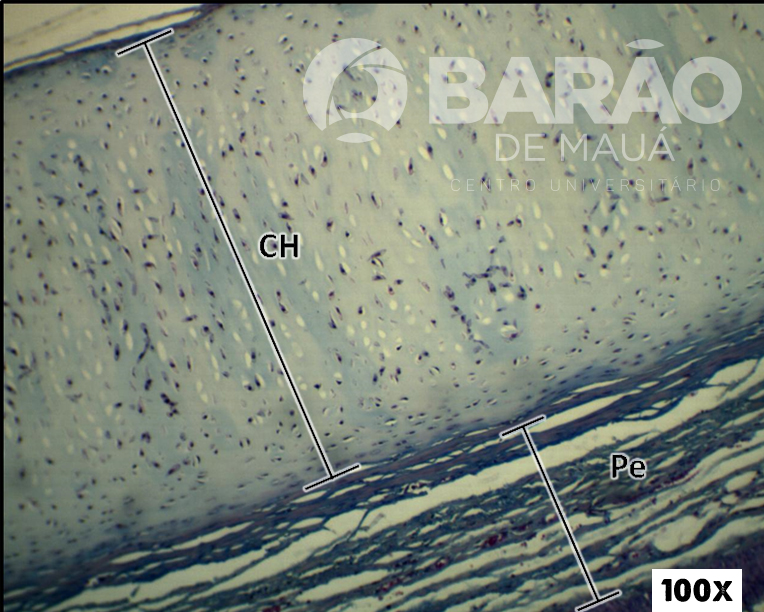 Traqueia - CH = cartilagem hialina e Pe = pericôndrio - Coloração: TM.