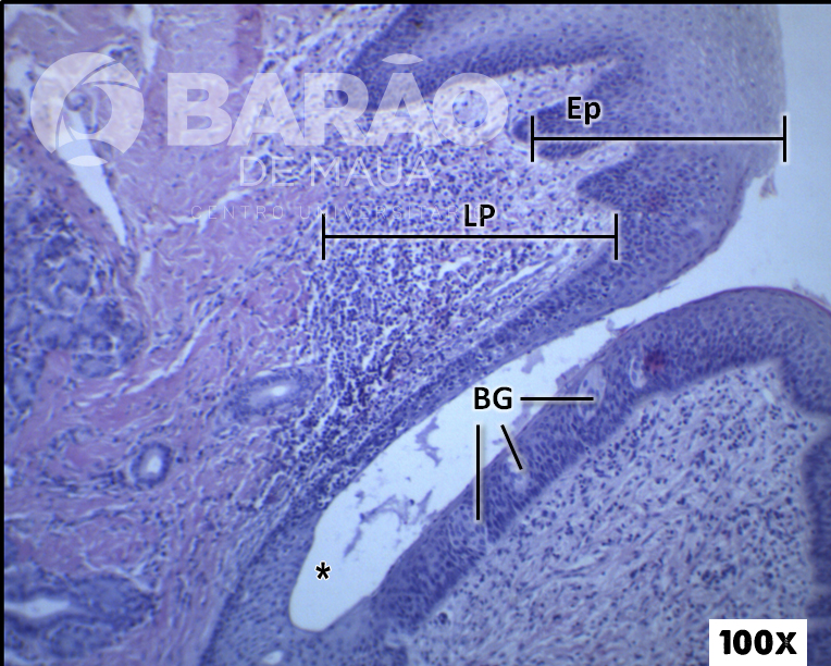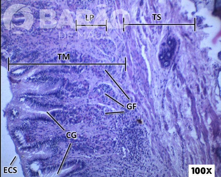 Transição Piloro Duodeno - FL = folículo linfático, MI = mucosa intestinal, TS = submucosa e GlB = glândulas de Brunner “duodenais” Seta: junção gastroduodenal - Coloração: H&E