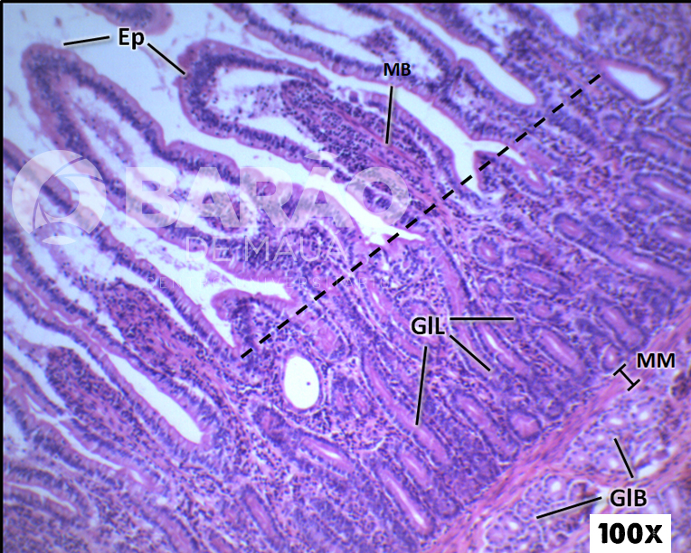 Duodeno - Ep = epitélio, MB = M. de Brucke, GlI = glândulas de Lieberkuhn “intestinais”, MM = muscular da mucosa, GlB = glândulas de Brunner “duodenais”, Linha tracejada = limite entre a base das vilosidades e as glândulas intestinais - Coloração: H&E