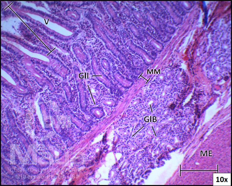 Duodeno - V= vilosidades, GlI = glândulas intestinais, MM = muscular da mucosa, GlB= glândulas de Brunner “duodenais” e ME = muscular externa - Coloração: H&E.