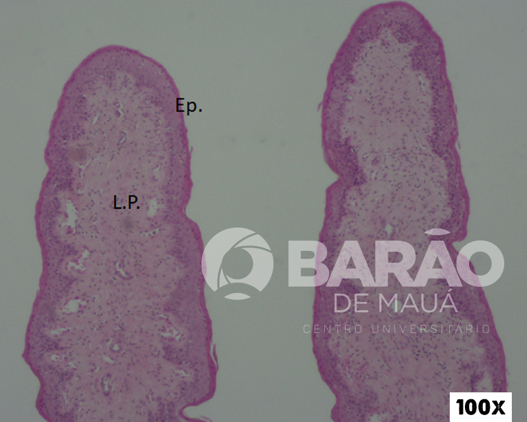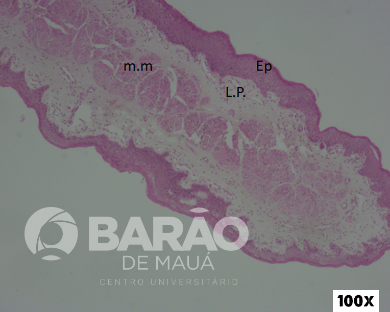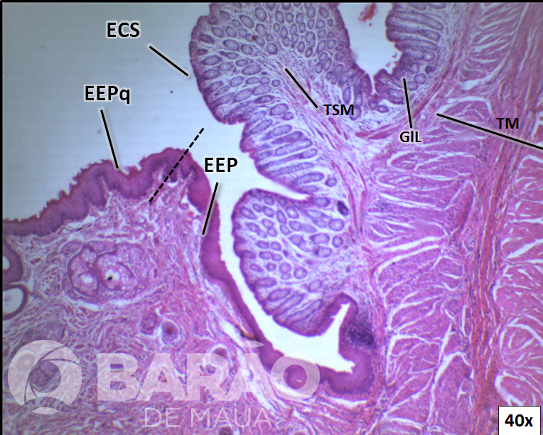 Junção Piloro - Duodeno - TM = túnica mucosa, LP = lâmina própria, MM = muscular da mucosa, EP = esfincter pilórico - Coloração: H&E