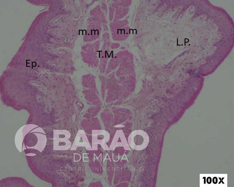 Junção Piloro - Duodeno - TM = túnica mucosa, LP = lâmina própria, MM = muscular da mucosa, EP = esfincter pilórico - Coloração: H&E.