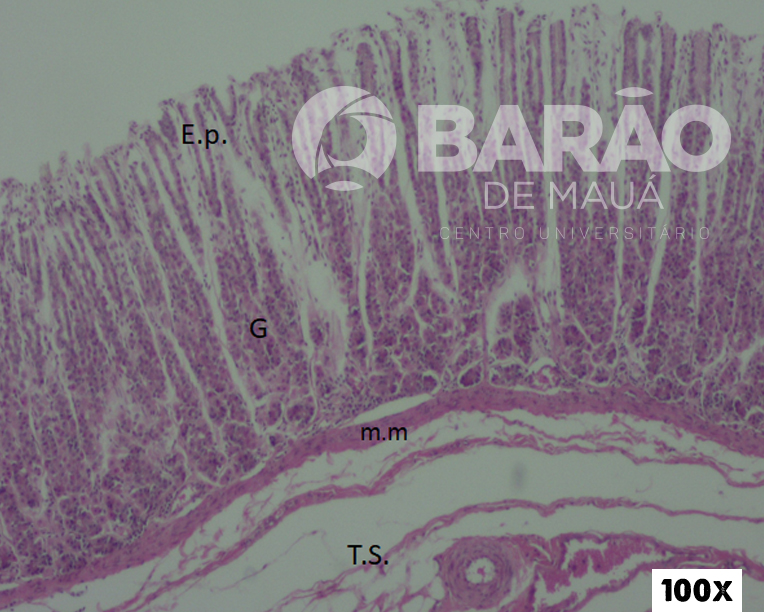 Duodeno - V= vilosidades, GlI = glândulas intestinais, MM = muscular da mucosa, GlB= glândulas de Brunner “duodenais” e ME = muscular externa - Coloração: H&E